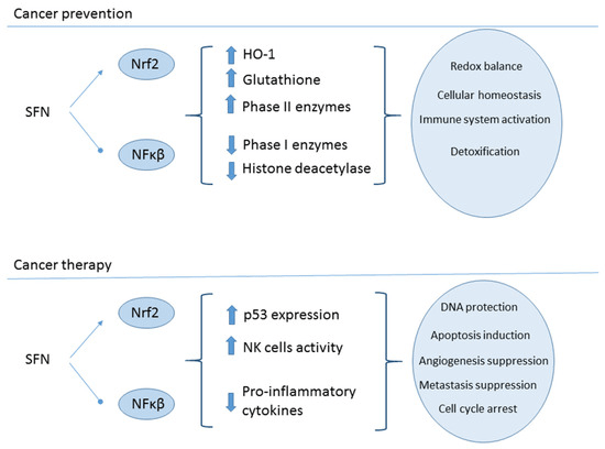 Sulforophane’s anti-cancerous effects are tied to it’s epigenetic modulation activity, which induce various cellular mechanisms that attack and/or prevent cancer cells from progressing, which include apoptosis activation, nuclear factor-κB (NF-kB) pathway inhibition, and cell cycle arrest induction (Hyun, 2020). Additionally, SFN’s immune-enhancing effects could further attest to SFN’s anti-cancerous effects, as research conducted on prostrate cancer showed an increase in natural killer cell cytotoxicity and T cell infiltration, resulting in a reduction of metastasis (Mahn & Castillo, 2021).